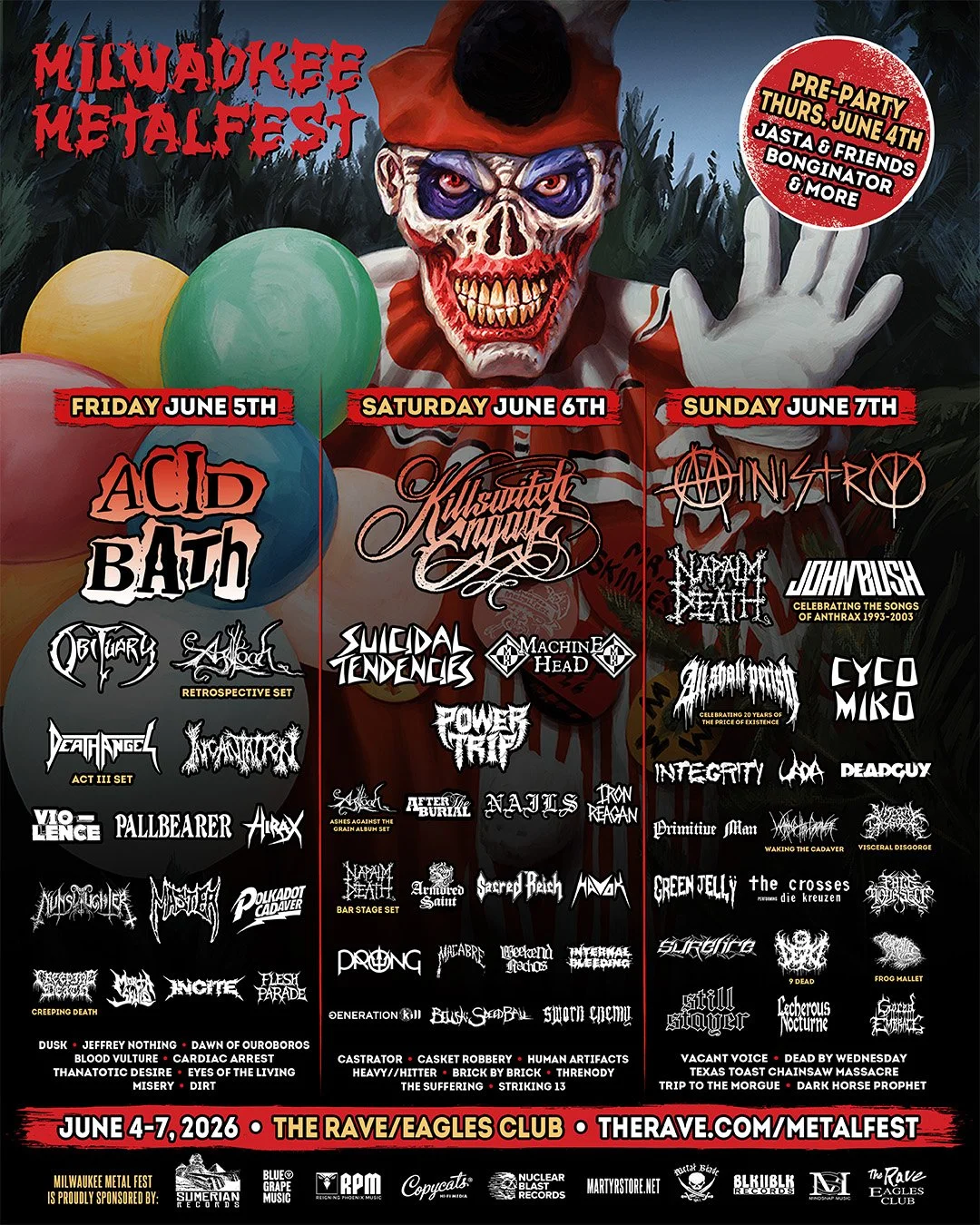 Fans can get access to the Thursday pre-party on June 4 for FREE with the purchase of a 3-day festival pass to MILWAUKEE METAL FEST. Come see ACID BATH, KILLSWITCH ENGAGE, MINISTRY, OBITUARY, AGALLOCH + many more for the BEST WEEKEND EVER! The festival will once again return to The Rave/Eagles Club from June 5 - 7, 2026, with the pre-party kicking off on June 4! Three-day passes, two-day passes, single-day tickets, and a limited number of reserved seats are on sale now. For the full lineup, ticket options, and festival updates can be found at THIS LOCATION.