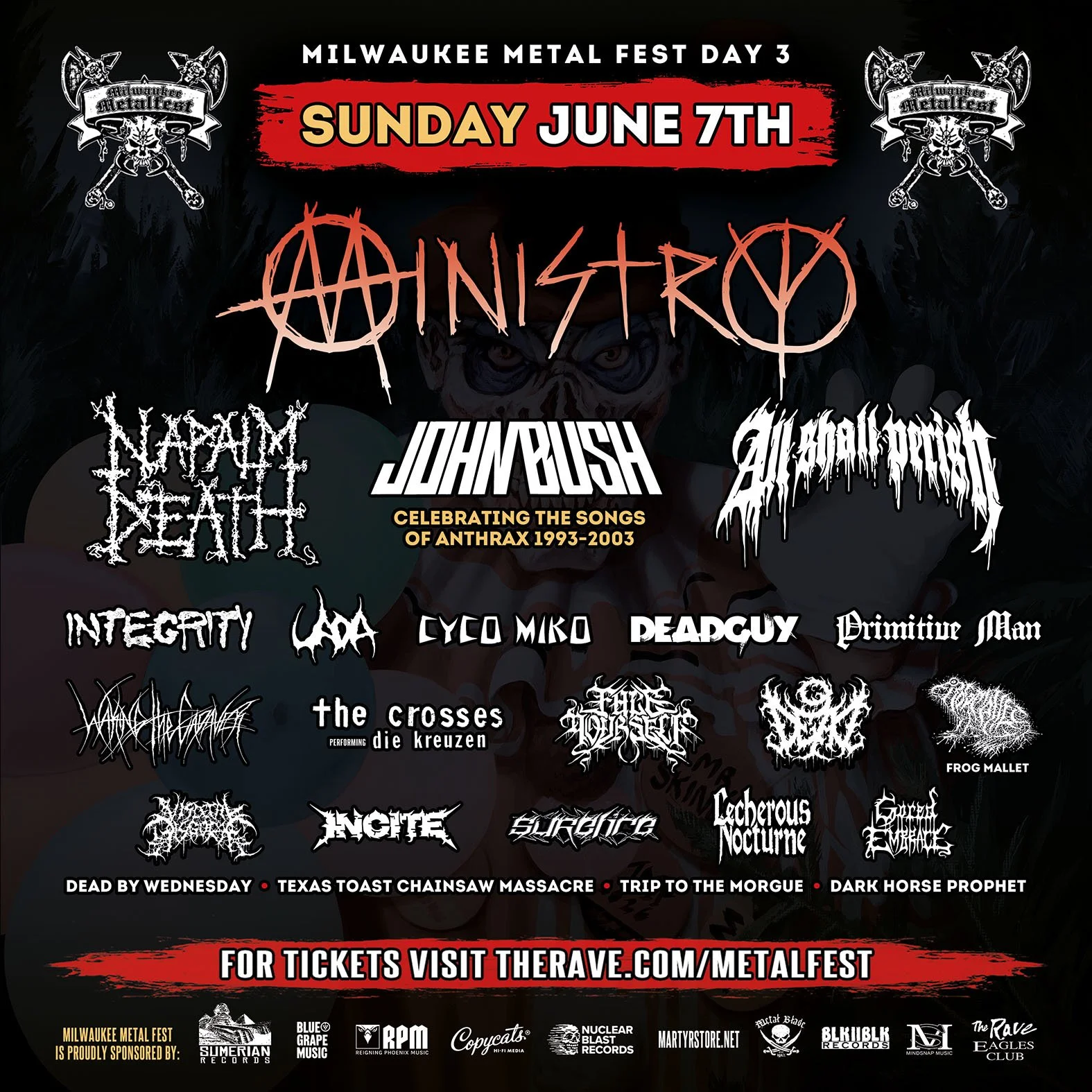 The complete MMF Day 3 line up for Sunday June 7th is in! Please welcome NAPALM DEATH, PRIMITIVE MAN & FACE YOURSELF. They join us, MINISTRY, JOHN BUSH PERFORMING HIS ANTHRAX ERA, ALL SHALL PERISH, INTEGRITY, UADA, DEADGUY, WAKING THE CADAVER and many more!